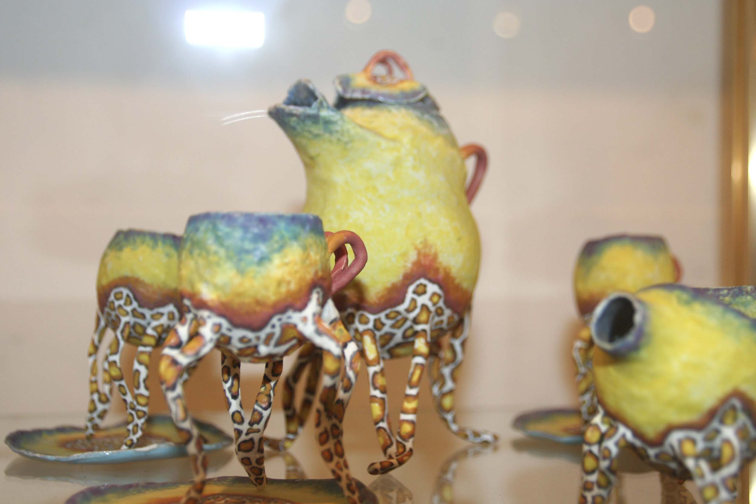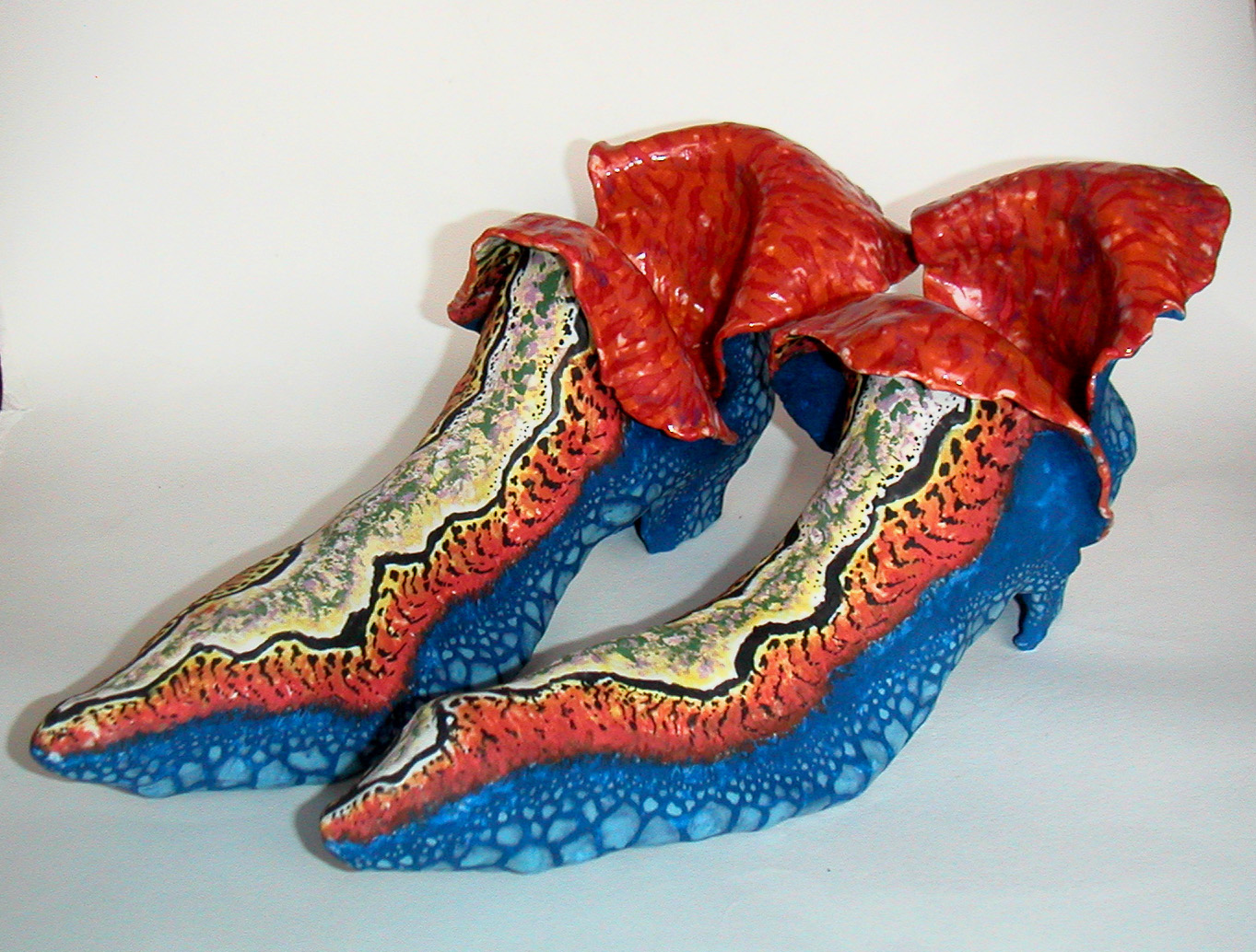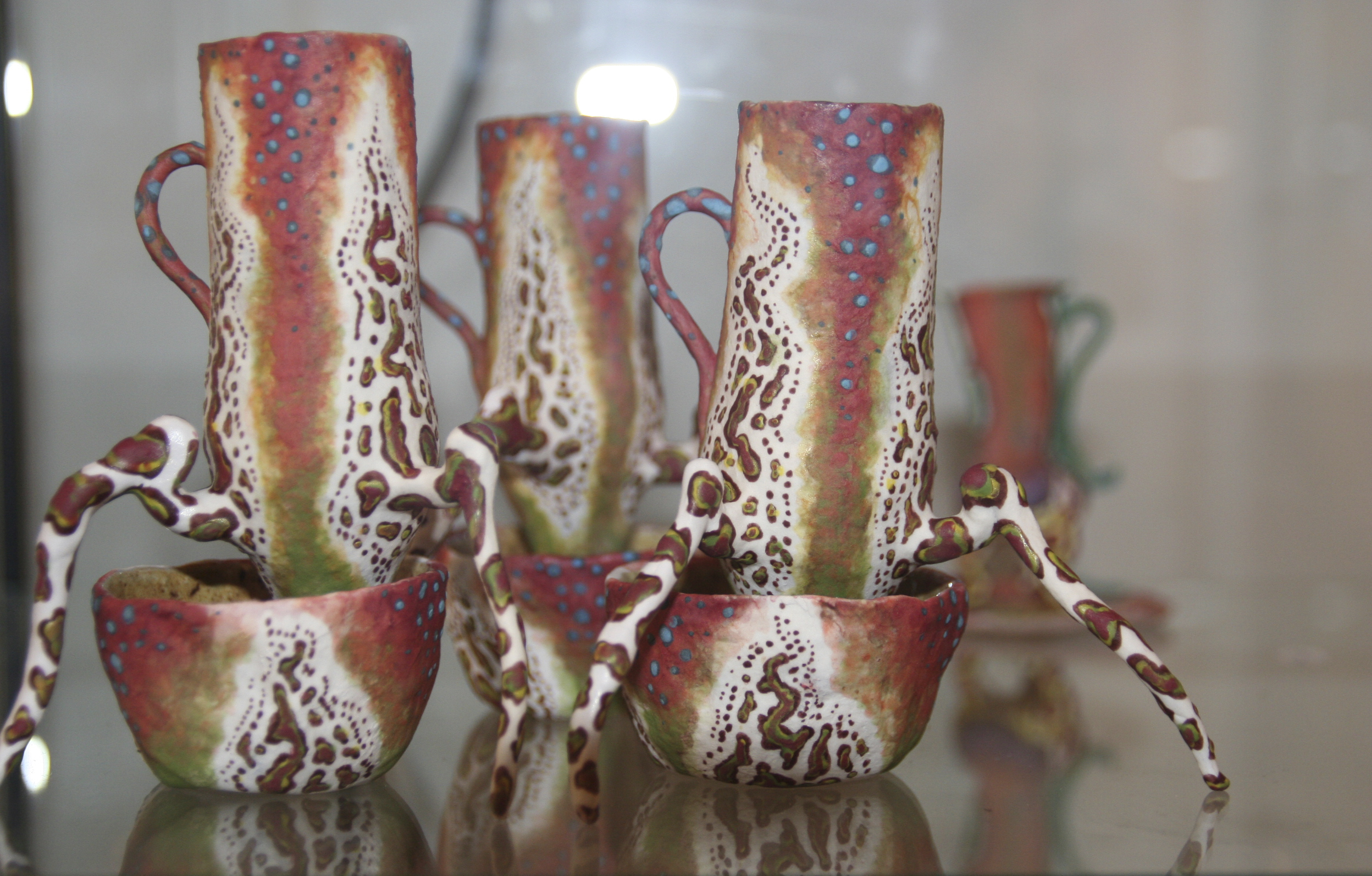 Tegenwoordig maak ik vooral kopjes en vazen. En ook wel sieraden en zelfs schoenen. Uit de kopjes kun je niet drinken, maar die kopjes kunnen wél lopen, dansen, doorzakken en overhangen. En de vazen? Je mag geen water in ze gieten. Ze kunnen wél lopen, staan, rollen, tollen, wankelen en wiebelen. Op de schoenen kun je trouwens ook niet lopen, maar net als de kopjes kunnen de schoenen wel zelf dansen. Al die voorwerpen hebben net als de sieraden maar één functie: ze zijn om naar gekeken te worden, voor de sier.